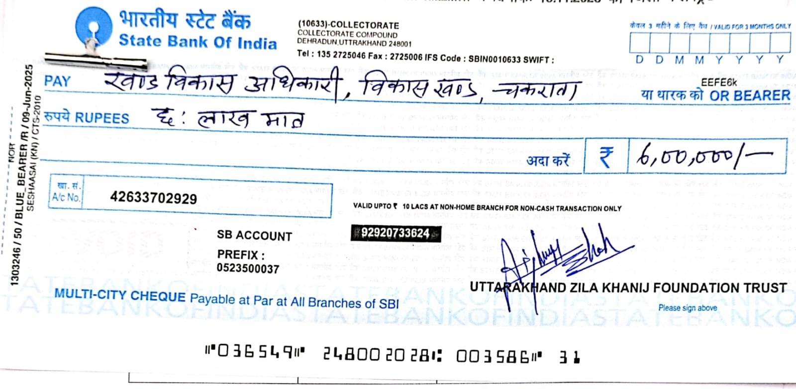 शासी परिषद के अध्यक्ष एवं अन्य सदस्यों द्वारा प्रस्ताव पर अनुमोदन प्रदान करते हुए कुल रु० 10.00 लाख (रुपये दस लाख मात्र) की स्वीकृति दी गई है, जिसमें से 60 प्रतिशत अर्थात रु० 6,00,000/- (रुपये छः लाख मात्र) की धनराशि प्रथम किस्त के रूप में खण्ड विकास अधिकारी, विकासखण्ड चकराता को निर्गत किए जाने हेतु जिला खनिज फाउंडेशन न्यास के निर्धारित बैंक खाते से चैक तैयार किया गया है। शेष 40 प्रतिशत अर्थात रु० 4,00,000/- (रुपये चार लाख मात्र) की धनराशि उपयोगिता प्रमाण पत्र प्रस्तुत किए जाने एवं तृतीय पक्ष द्वारा जाँच आख्या प्राप्त होने के उपरान्त निर्गत की जाएगी।