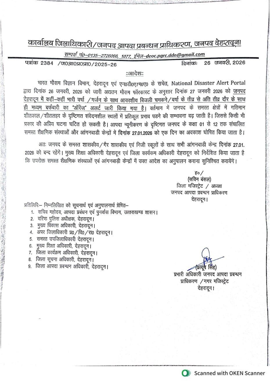 मौसम की गंभीर स्थिति और संभावित आपदा जोखिम को ध्यान में रखते हुए देहरादून जिला प्रशासन ने एहतियातन कक्षा एक से 12 तक संचालित सभी शैक्षणिक संस्थानों और आंगनबाड़ी केंद्रों में एक दिवसीय अवकाश घोषित किया है।