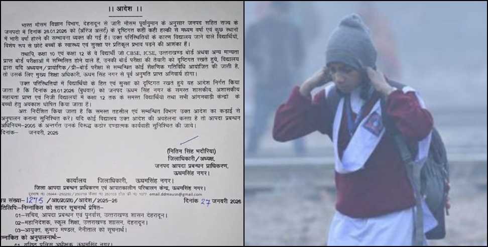 प्रशासन ने यह कदम संभावित खराब मौसम, जैसे तेज बारिश, ठंड और अन्य प्रतिकूल परिस्थितियों के मद्देनज़र उठाया है, ताकि छात्रों की सुरक्षा सुनिश्चित की जा सके। मौसम विभाग की चेतावनी के अनुसार, इन जिलों में मौसम का असर स्कूल आने-जाने पर जोखिम बढ़ा सकता है। मौसम पूर्वानुमान के चलते 28 जनवरी 2026 को रुद्रप्रयाग, ऊधमसिंह नगर, पिथौरागढ़, टिहरी गढ़वाल और देहरादून जिलों में कक्षा 1–12 के सभी सरकारी-निजी स्कूल और आंगनबाड़ी केंद्रों में अवकाश घोषित कर दिया गया है।